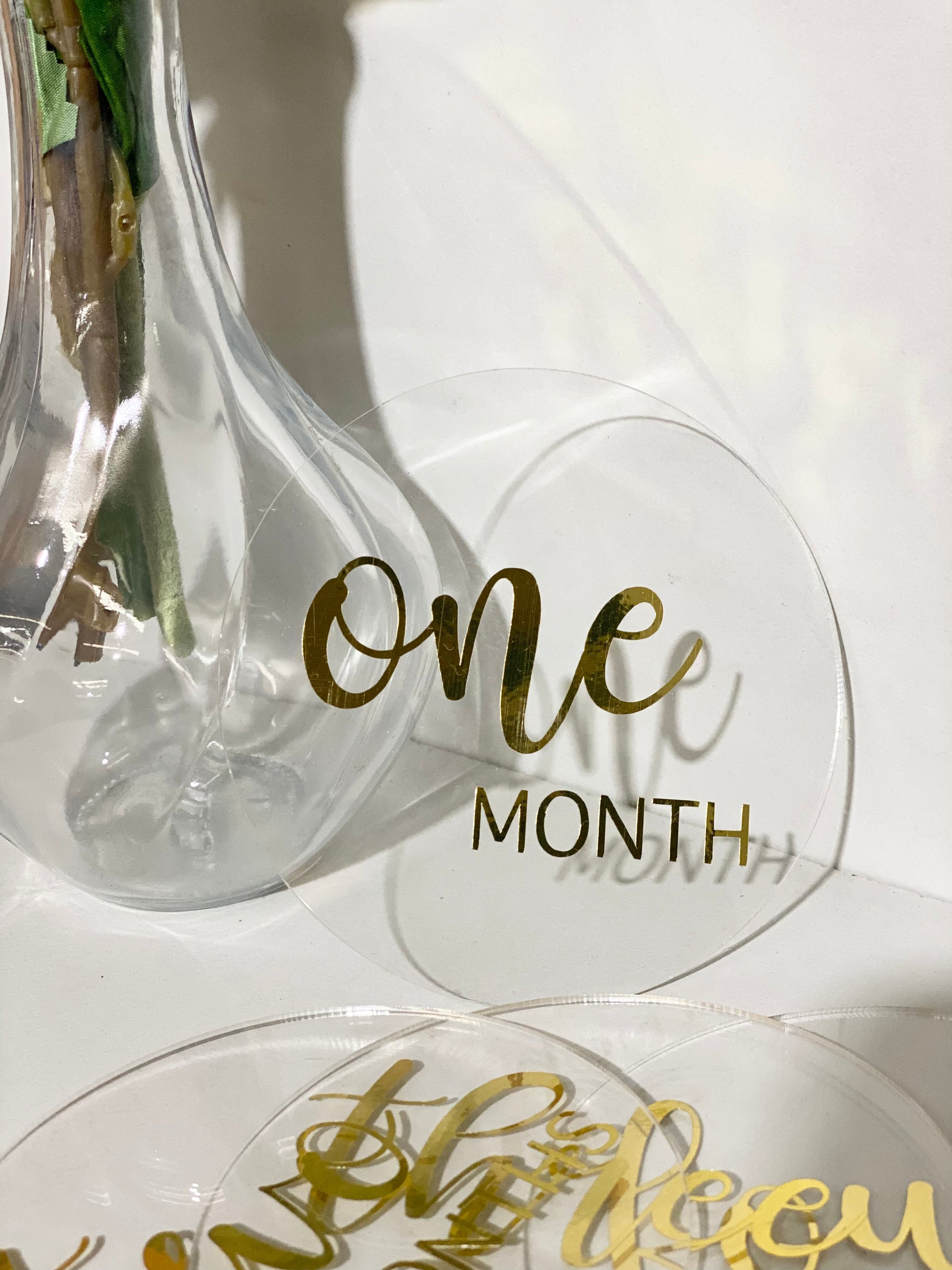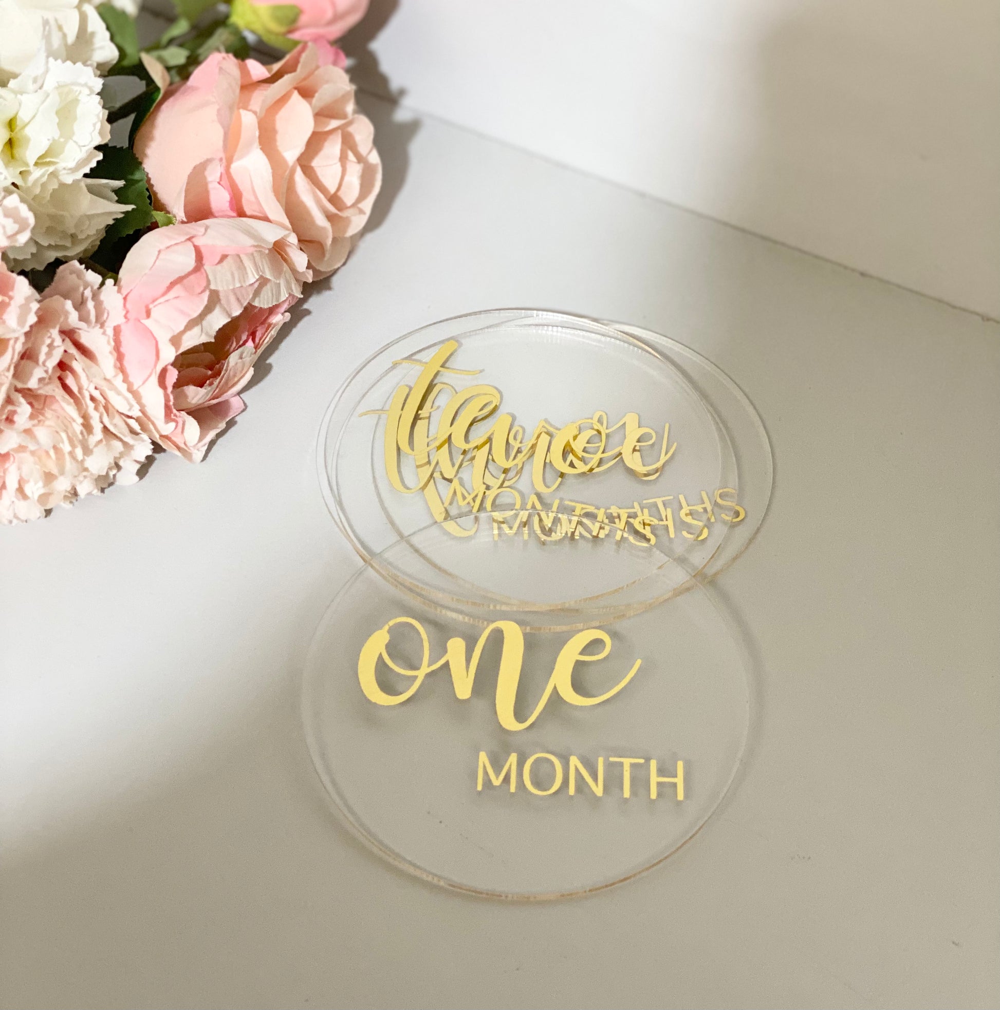 Set of 12 100mm acrylic discs customised with silver or gold metallic vinyl (1month-1year).