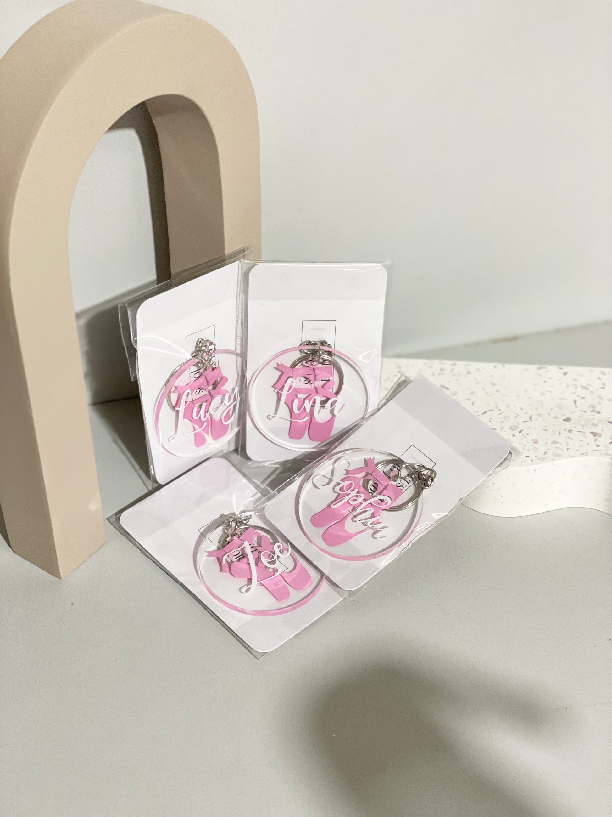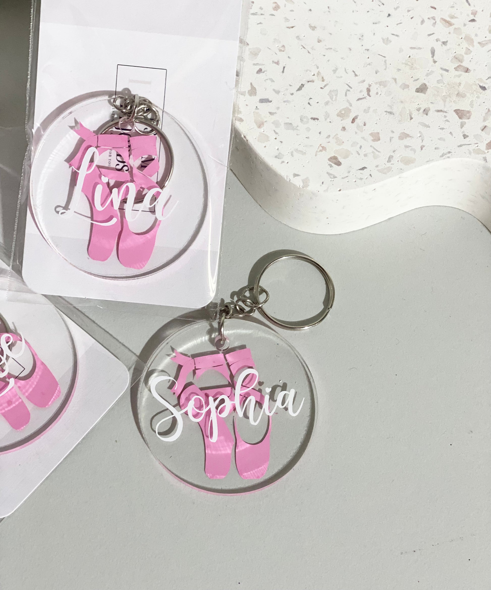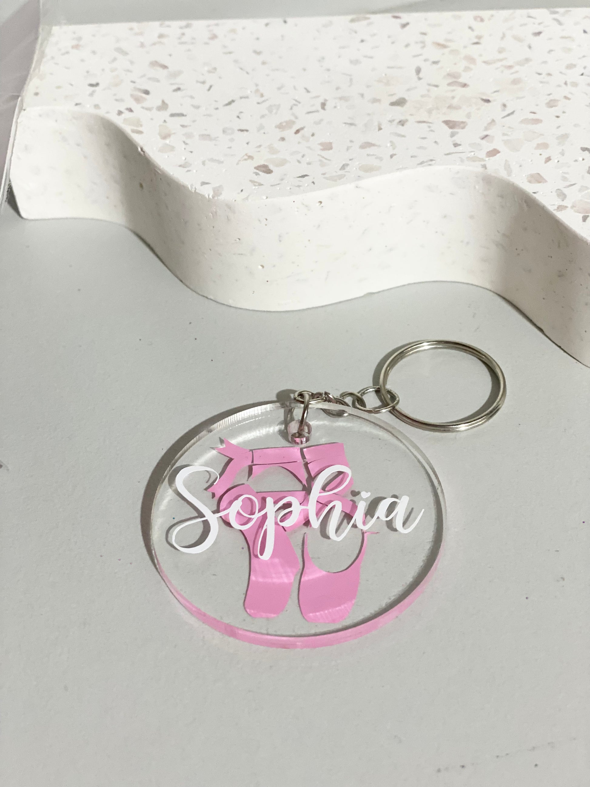 50mm acrylic keyring with pink pointe shoe detail and white vinyl custom name. Acrylic is 2mm in thickness