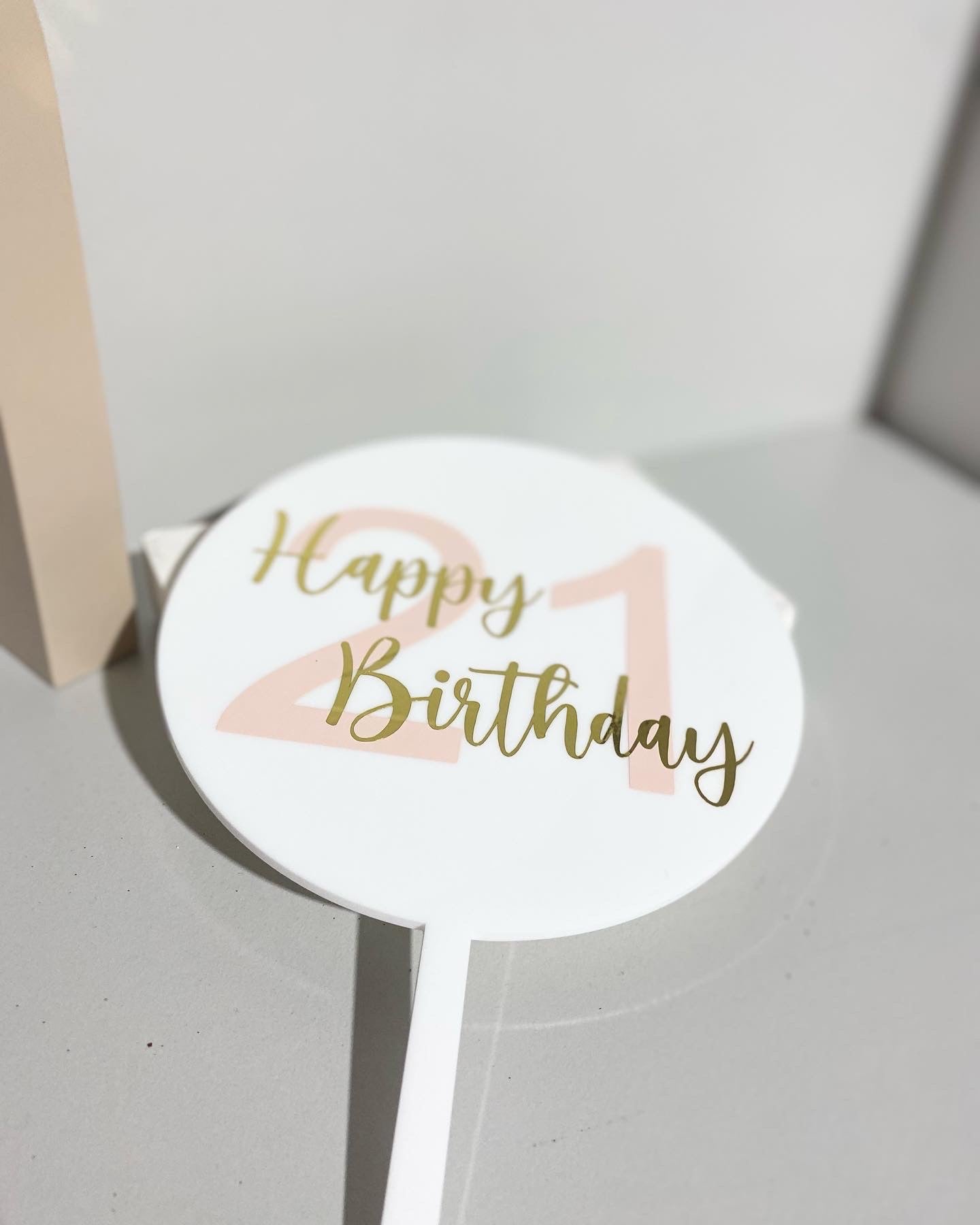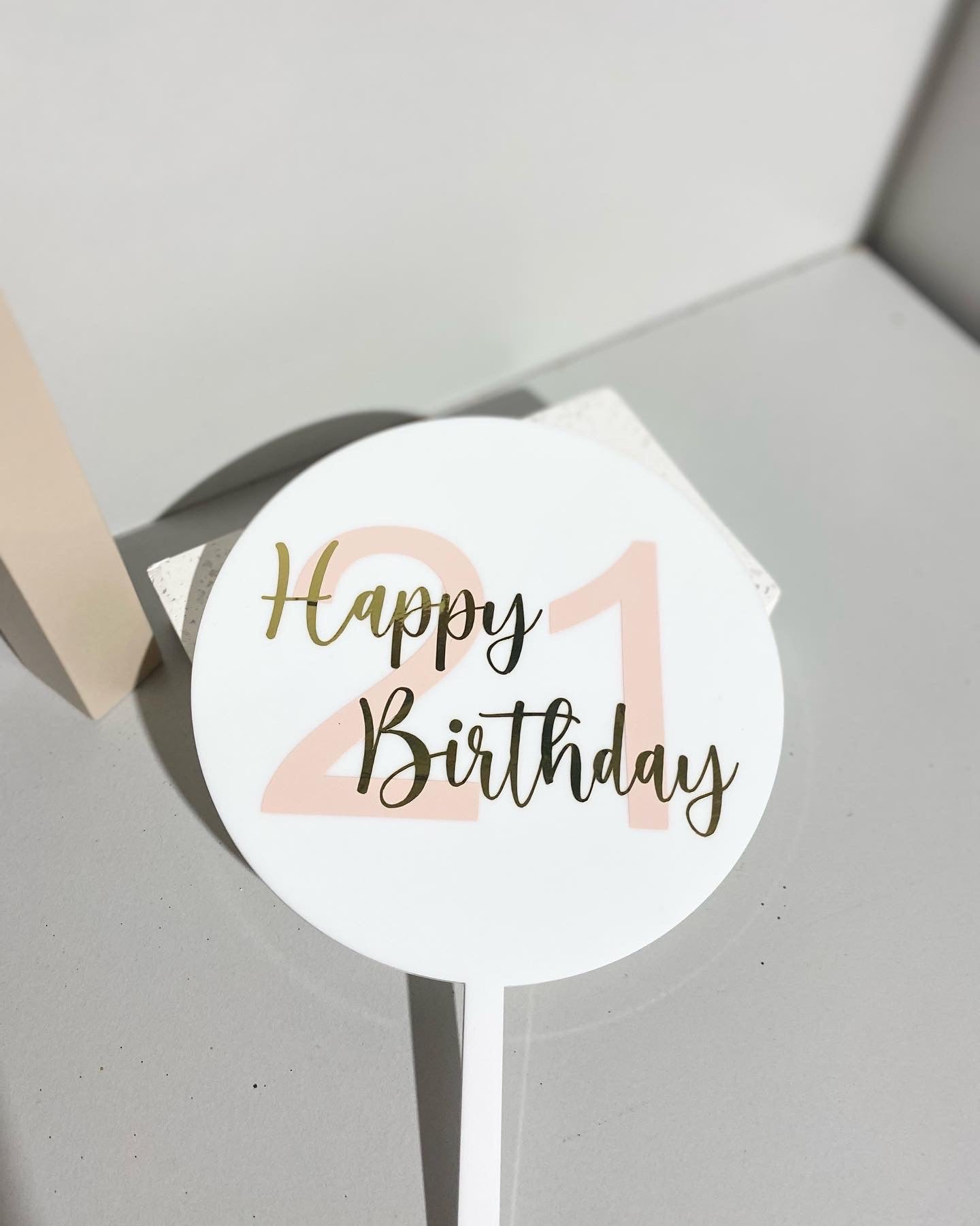 White acrylic round cake topper. 150mm round, 3mm thickness with layered vinyl customisation. Customised with Gold (pictured) or Silver vinyl "Happy Birthday".