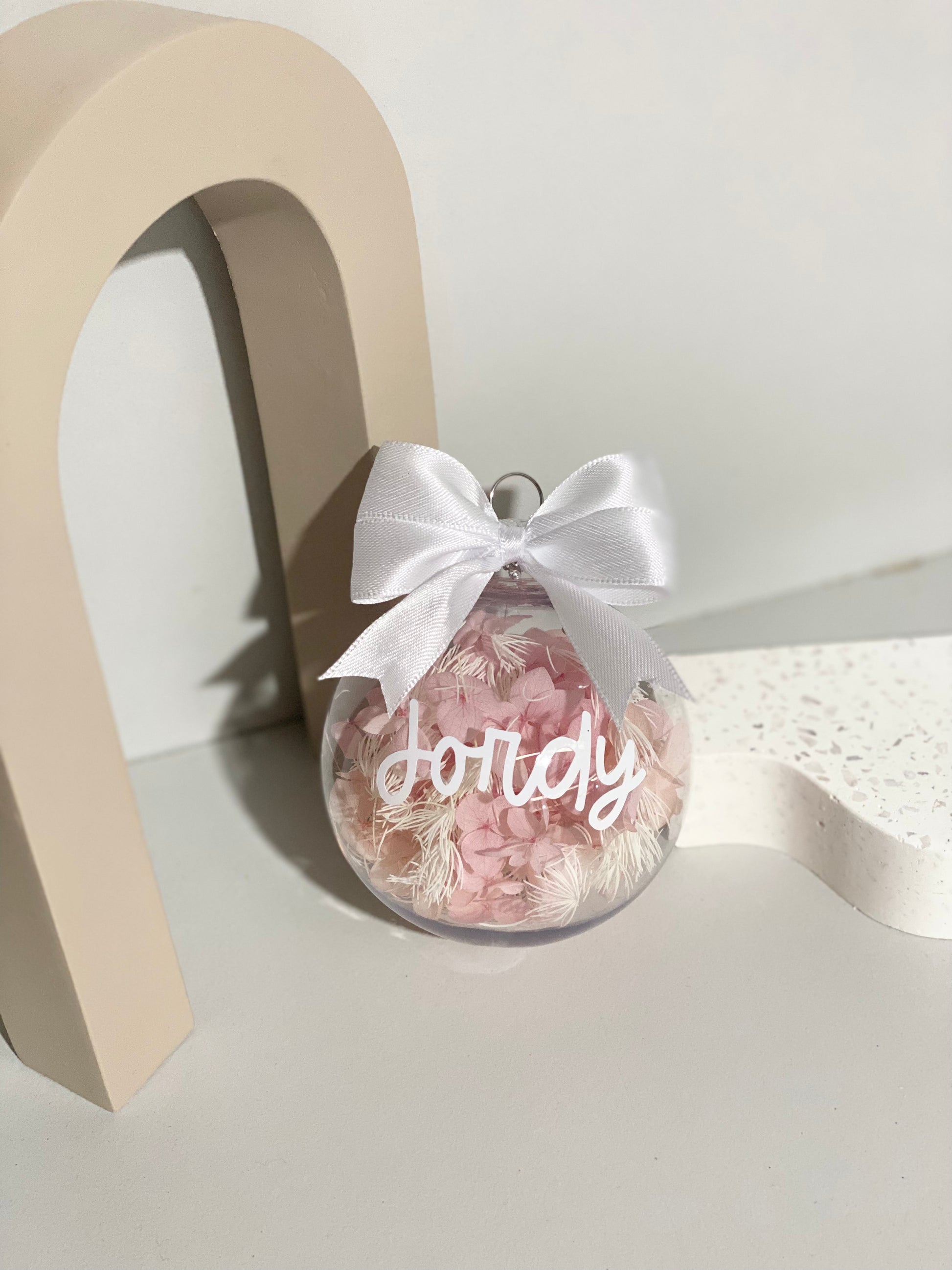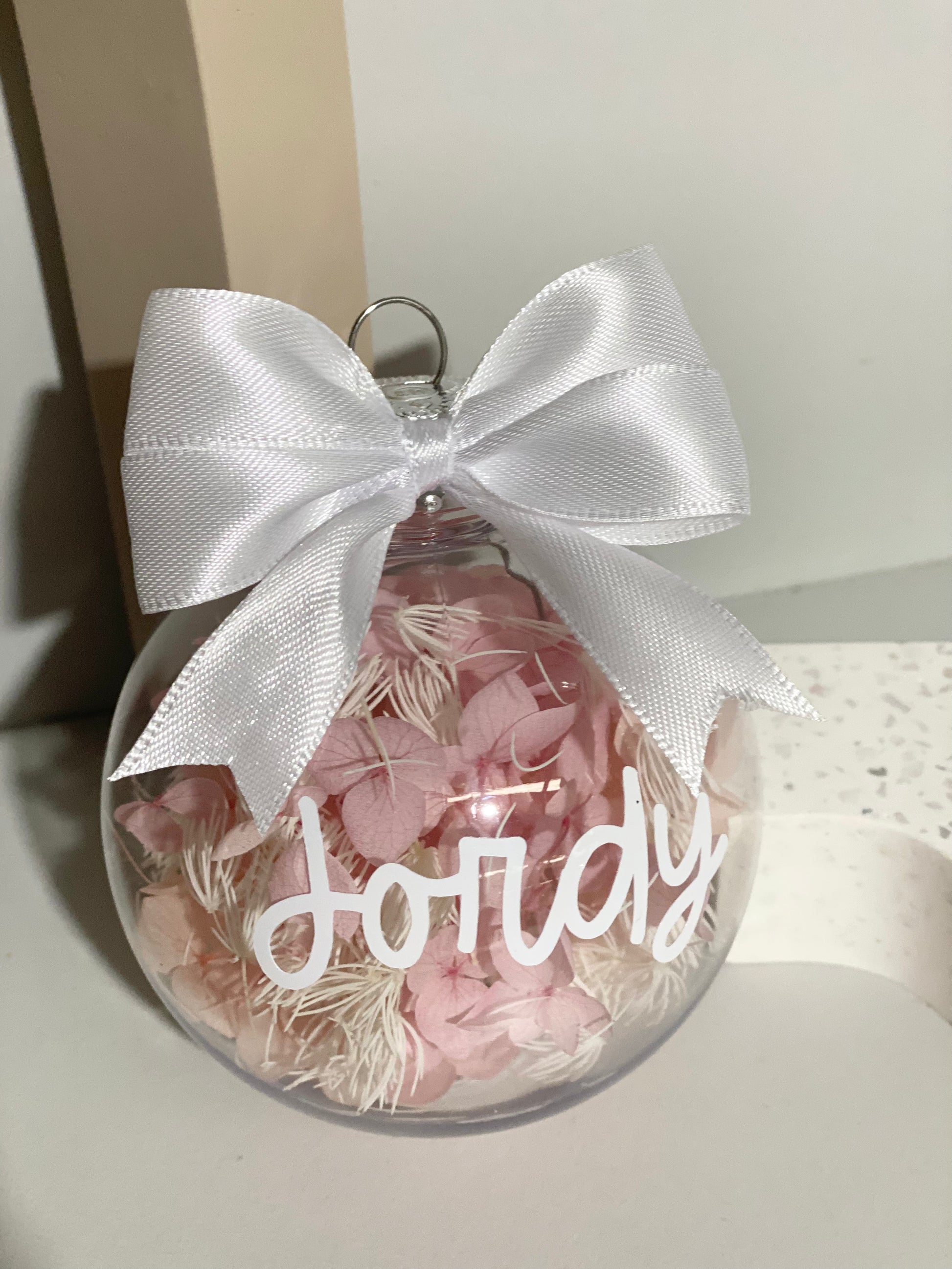 80mm Shatterproof plastic bauble with pink dried flowers, handmade satin bow, customisation and paper display box.