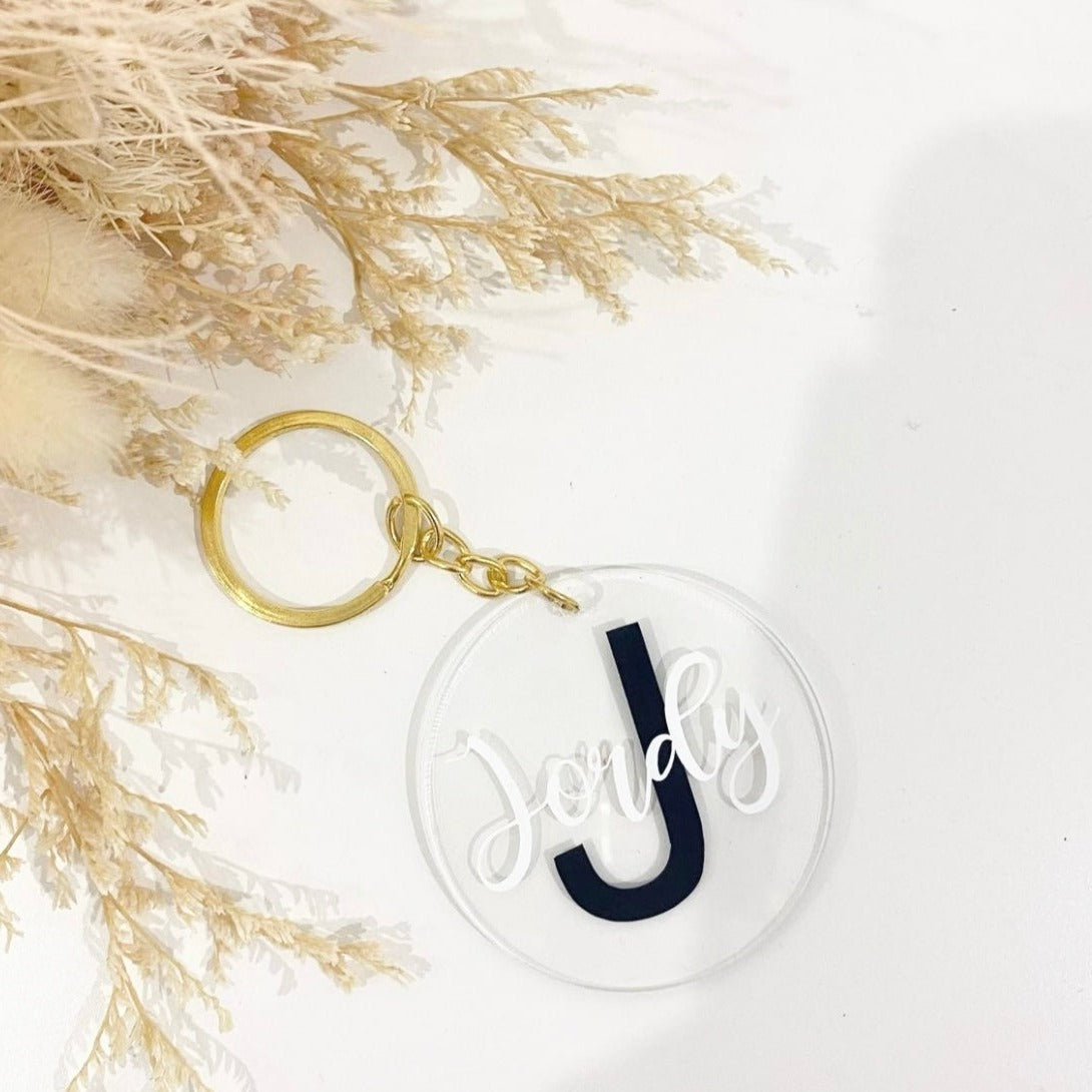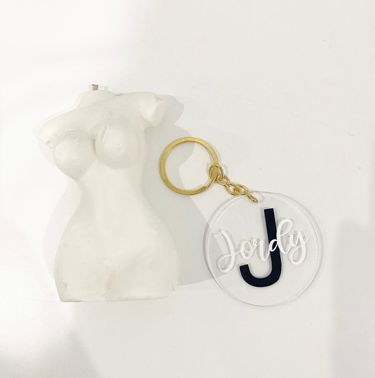 50mm acrylic keyring with vinyl letter on backside and custom name frontside.