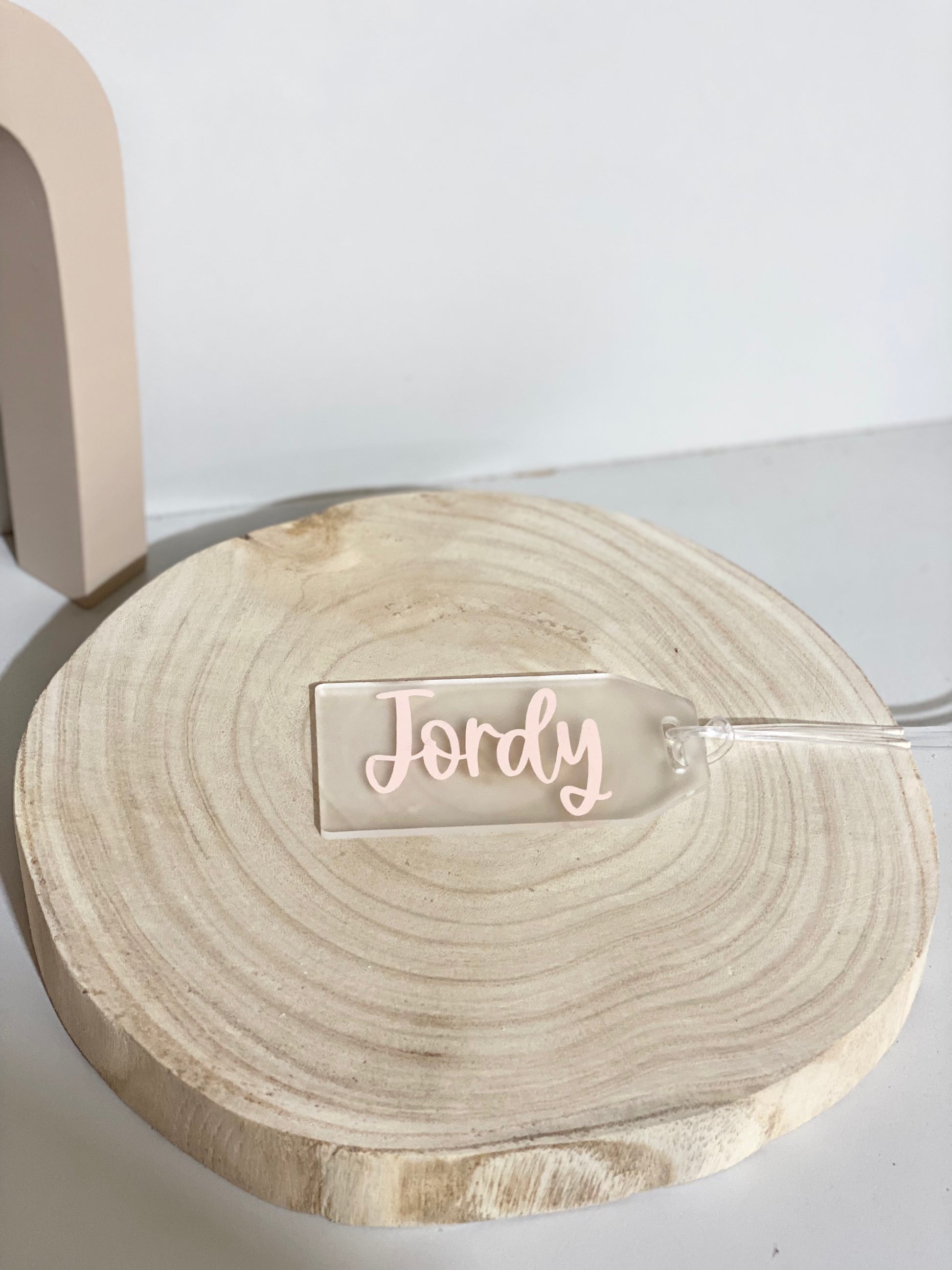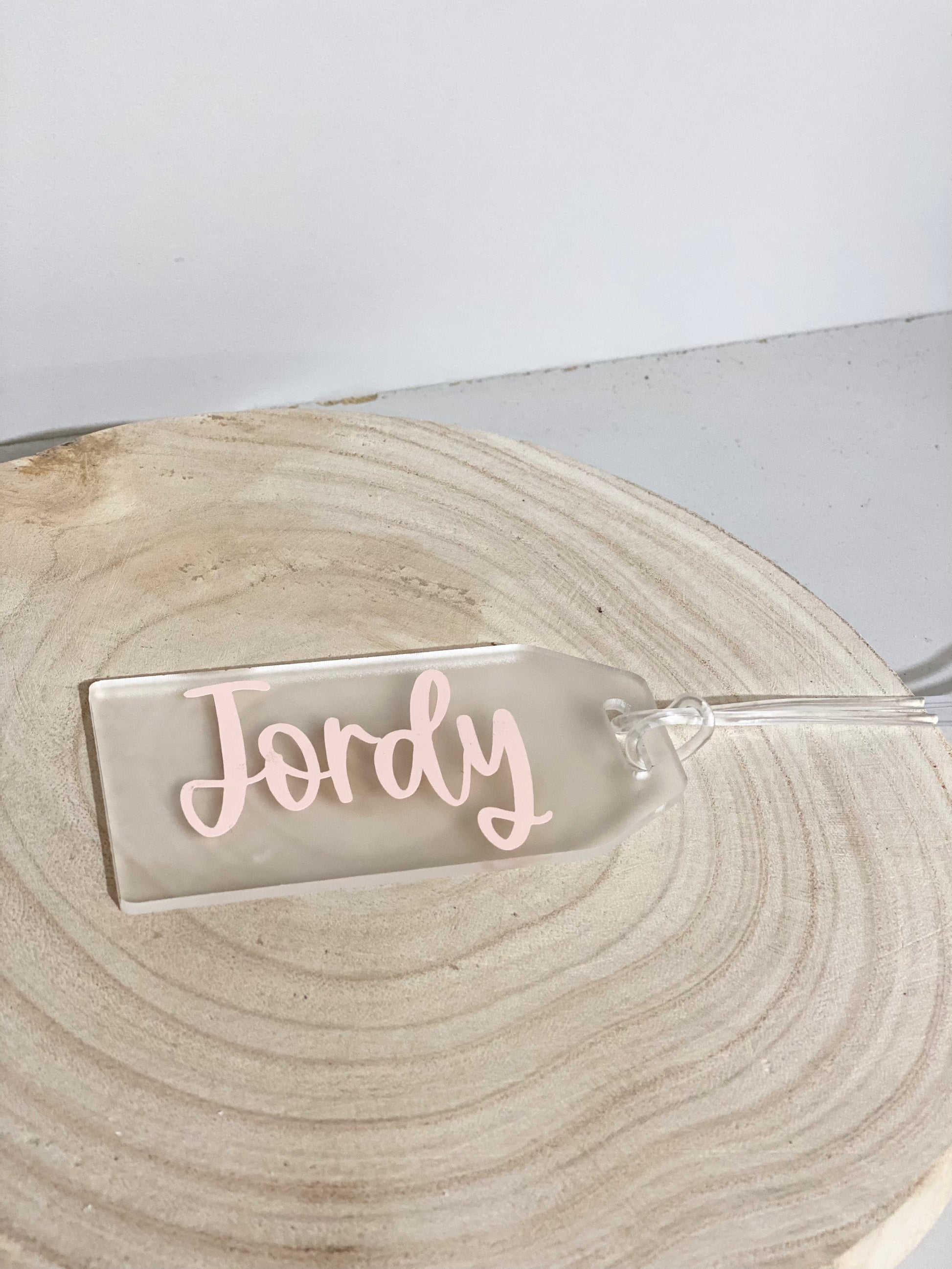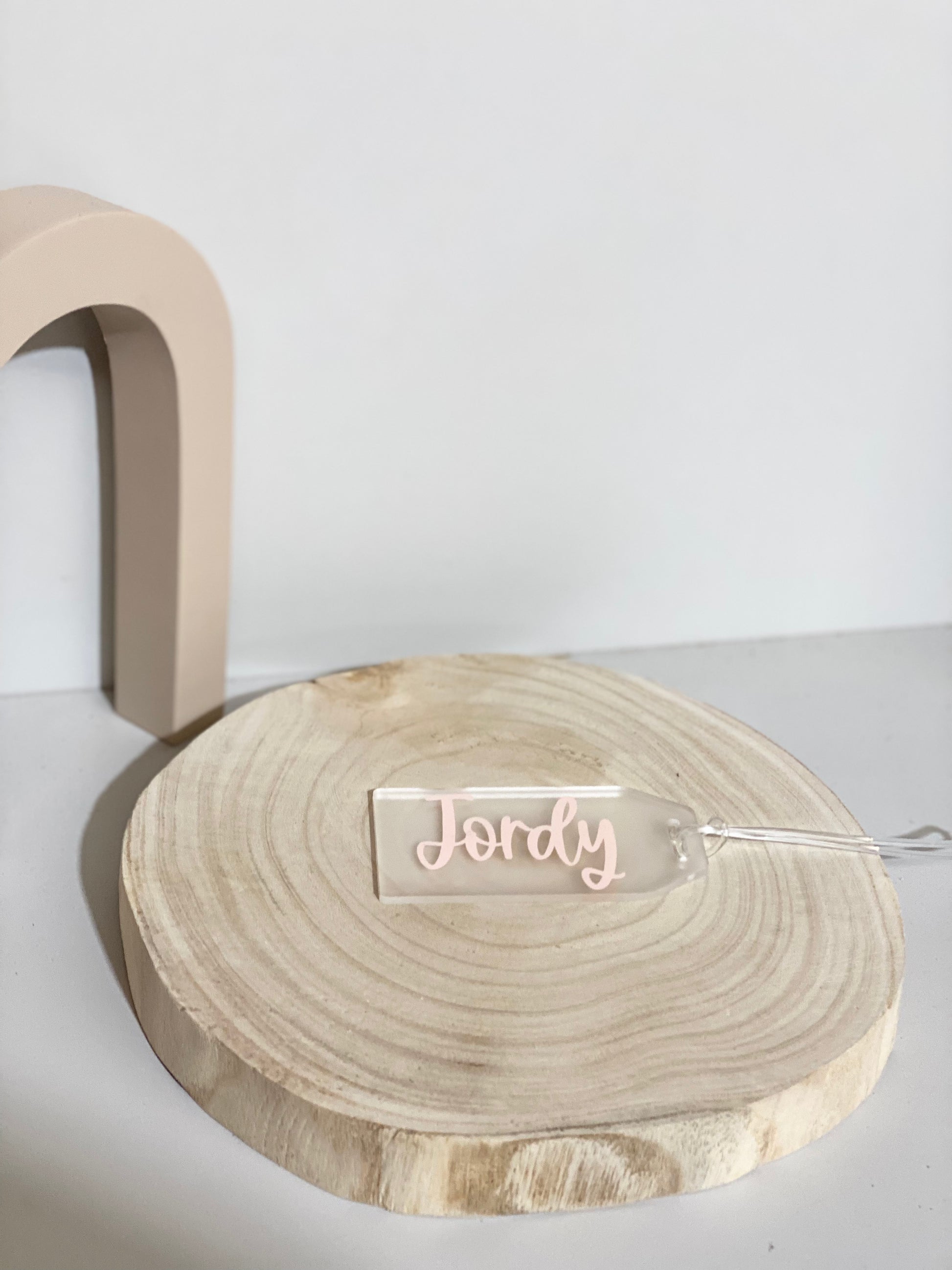 3mm frosted clear acrylic luggage tag with baby pink customised name. Each luggage tag comes with a clear strap.
