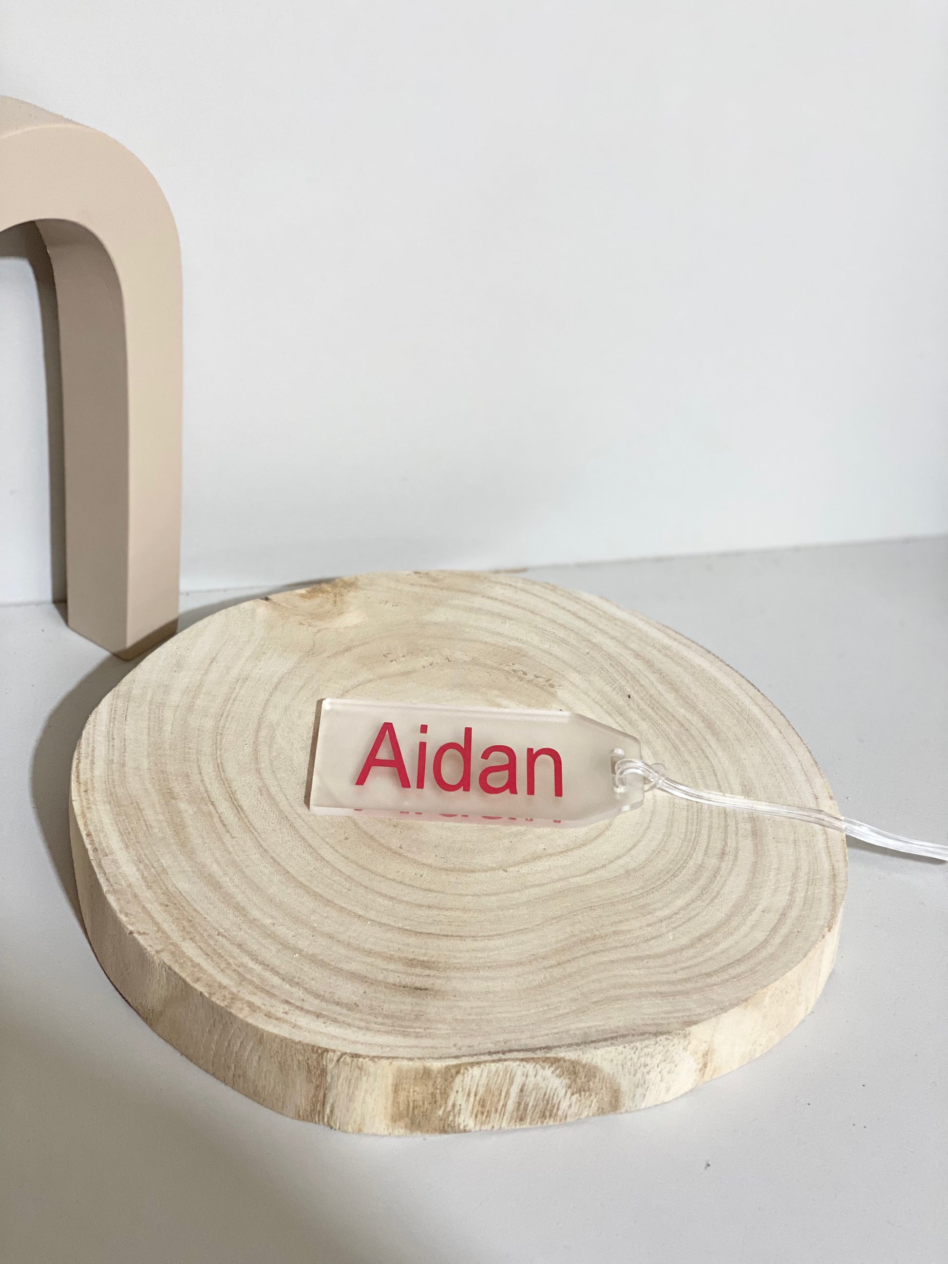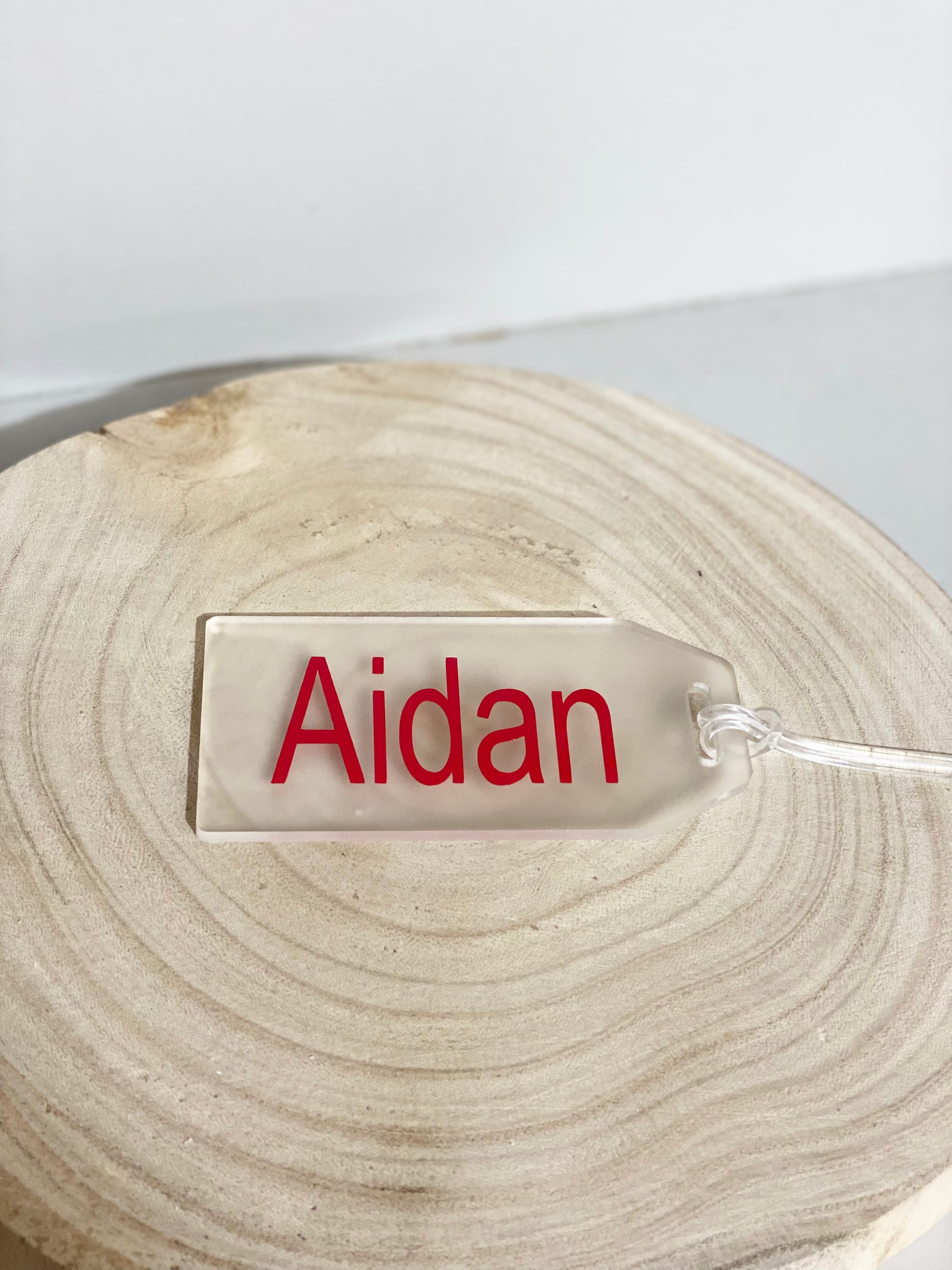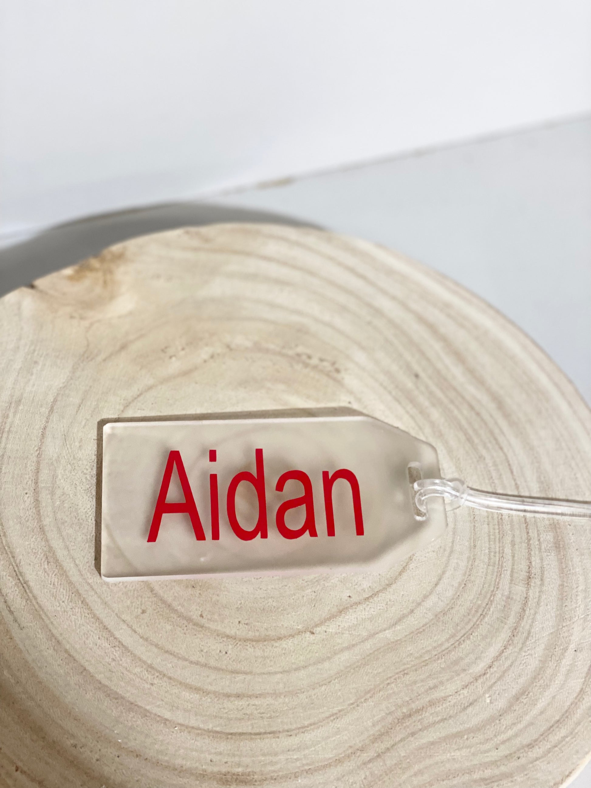 3mm frosted clear acrylic luggage tag with red customised name. Each luggage tag comes with a clear strap.
