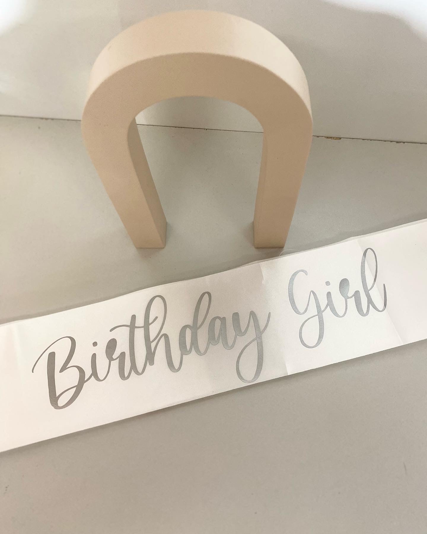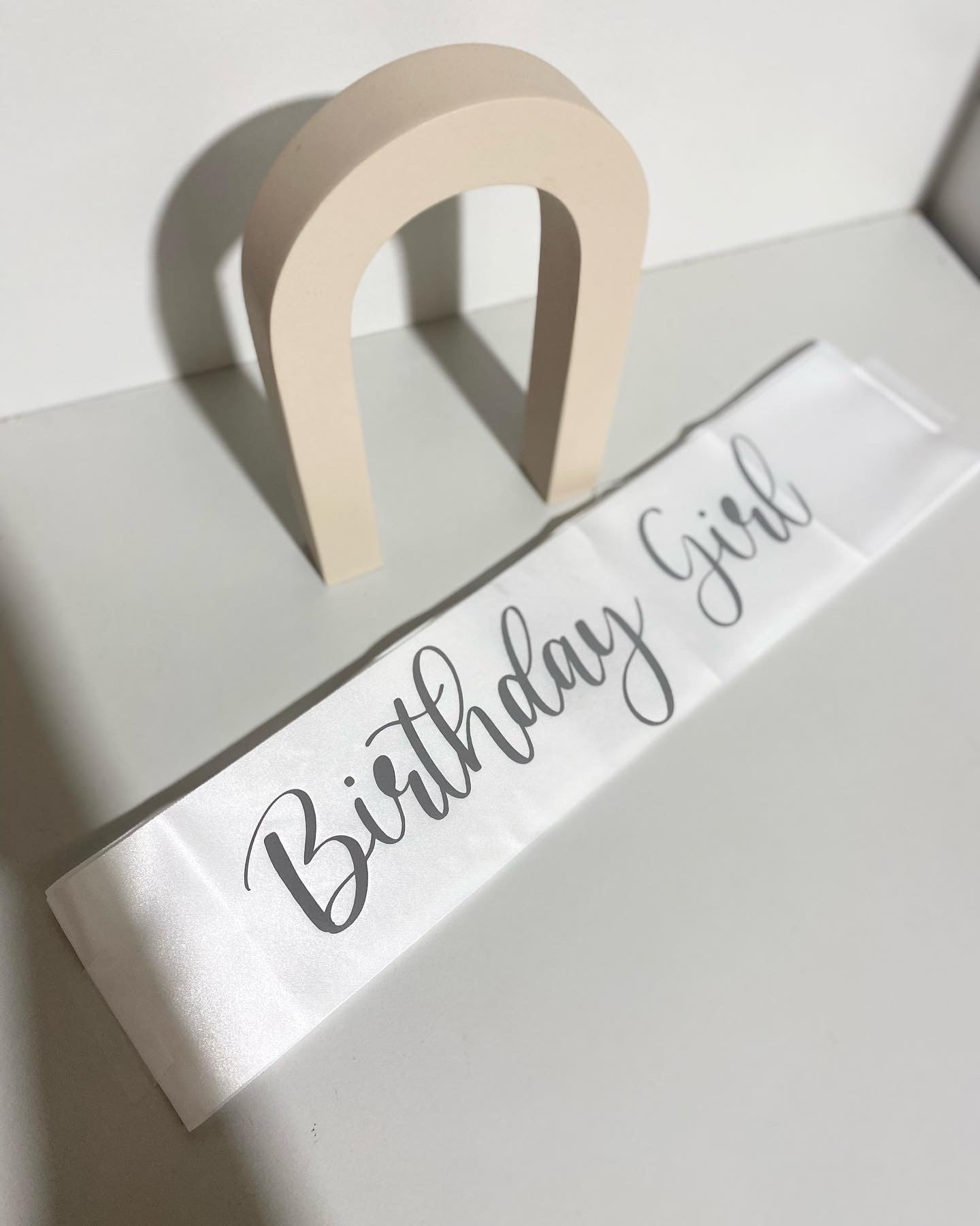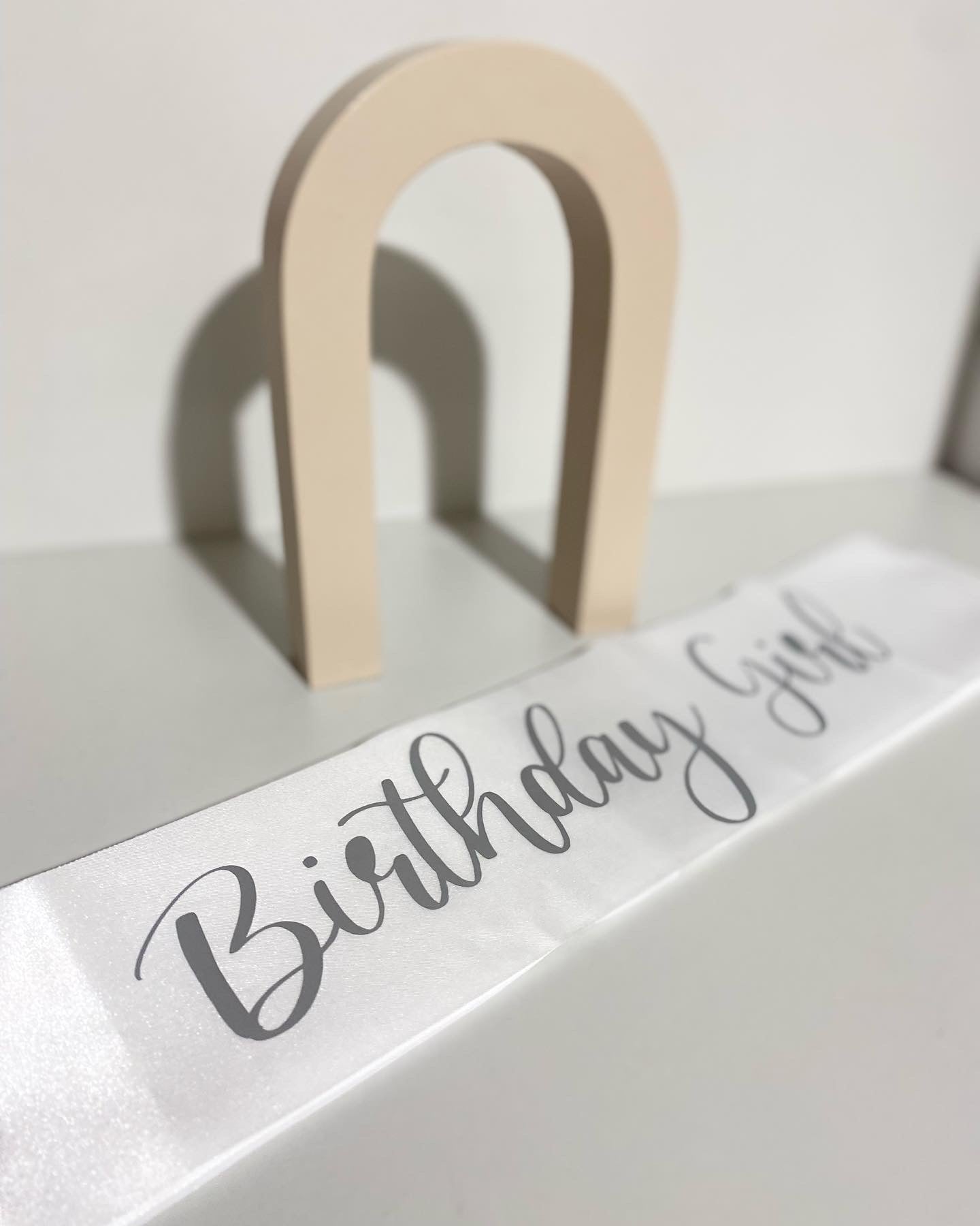 Satin Sashes measuring approximately 78cm x 9cm. Customised phrase (i.e., 'Birthday Girl' as pictured) and vinyl colour.